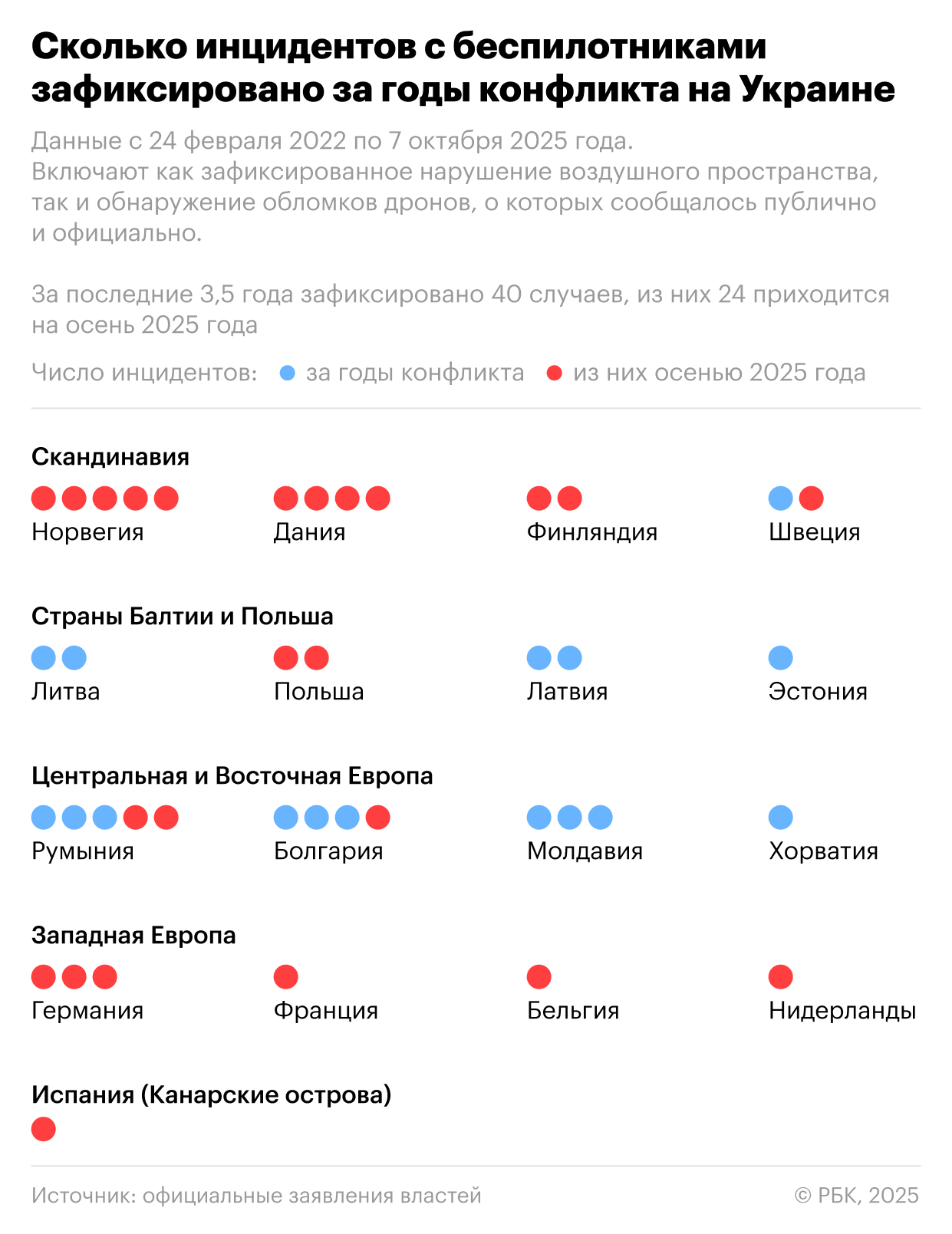 Похожие эпизоды в европейских странах наблюдались и до осенней эскалации, РБК проанализировал их динамику за все годы конфликта на Украине. При подсчетах мы учитывали только те эпизоды, которые официально прокомментировали власти соответствующих стран. Согласно подсчетам РБК, с февраля 2022-го всего отмечено 40 эпизодов нарушения воздушного пространства европейских стран (с учетом Молдавии и Норвегии дронами или обнаружения обломков БПЛА, 24 из них пришлись на осень 2025 года.