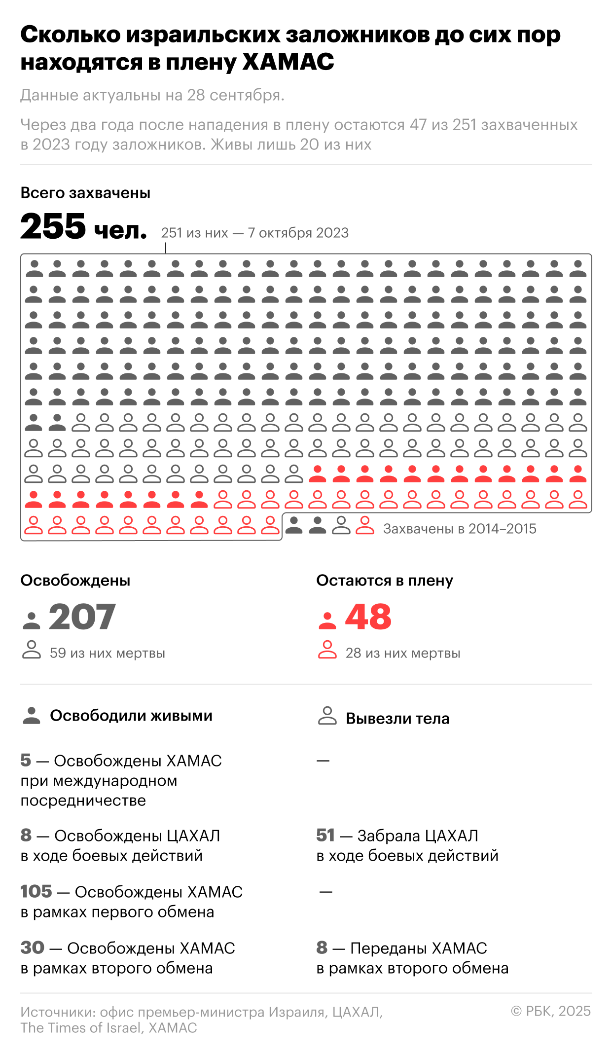 Заложники будут освобождены, скорее всего, в понедельник, 13 октября, говорил американский президент Дональд Трамп. «Они там в ужасном положении», — сказал он и добавил, что заложники «находятся глубоко под землей». Трамп на фоне продвижения переговоров говорил, что может прибыть на Ближний Восток в это воскресенье, 12 октября.